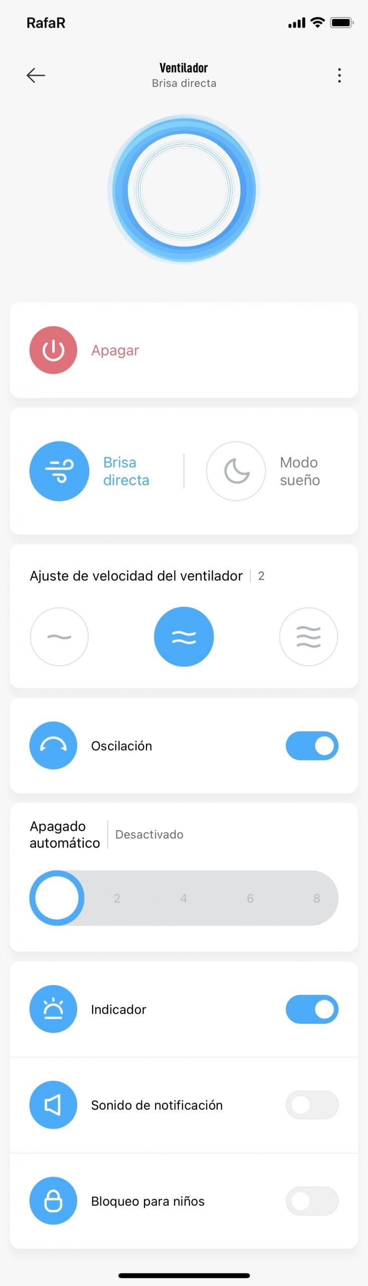 La parte “inteligente” de este ventilador recae en la app MiHome de Xiaomi. En ella puedes controlar todas las funciones que tiene el ventilador como puedes ver en la captura: