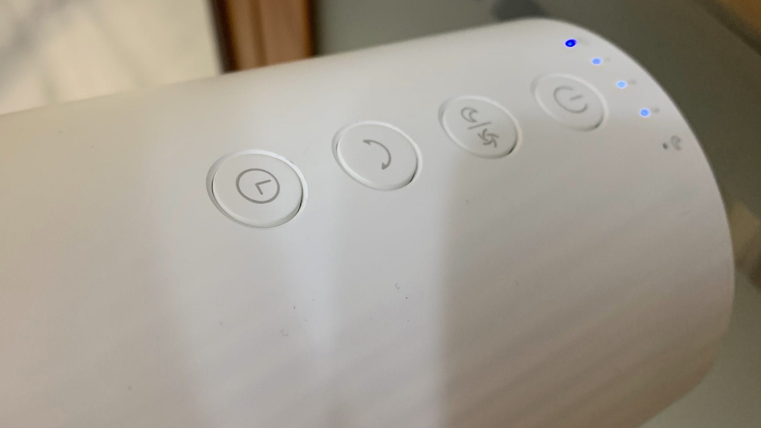 De izquierda a derecha, los botones son: temporizador, giro, selector de potencia y normal/noche, encender/apagar.