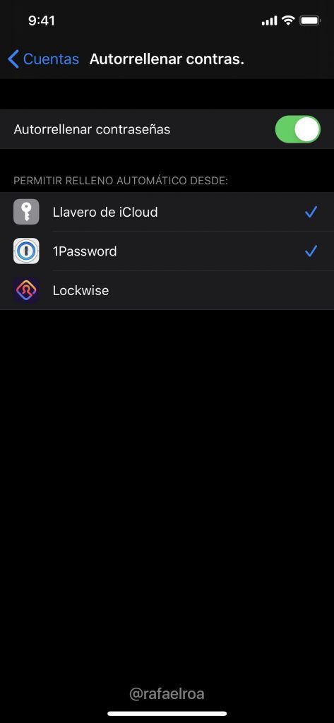 Yo tengo marcadas el llavero de iCloud y 1Password. Lockwise es el gestor de contraseñas de Firefox. Cuando usas Firefox en Mac, Windows, o Linux y tienes activada la sincronización en la nube de configuraciones y contráelas mediante esta app puedes integrar esa funcionalidad de iOS. El punto débil de esta app, que si es gratuita es que no te permite, aún, añadir elementos manualmente. Solo aparecen los que se añadan mediante Firefox, y nada de contraseñas de la autenticación en dos pasos.