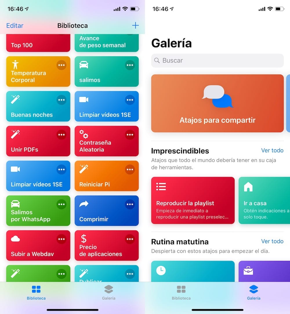 En la izquierda están todos los atajos que vayamos creando, en tu caso puede que esté vacío. En la derecha está la galería, donde apple va colgando aquellos atajos que pueden ser interesantes, y que para principiantes como tu son un buen comienzo para darle uso a la app y para abrirlos y empezar a estudiar cómo están hechos. Solo tienes que añadirlos a tu biblioteca y a jugar.