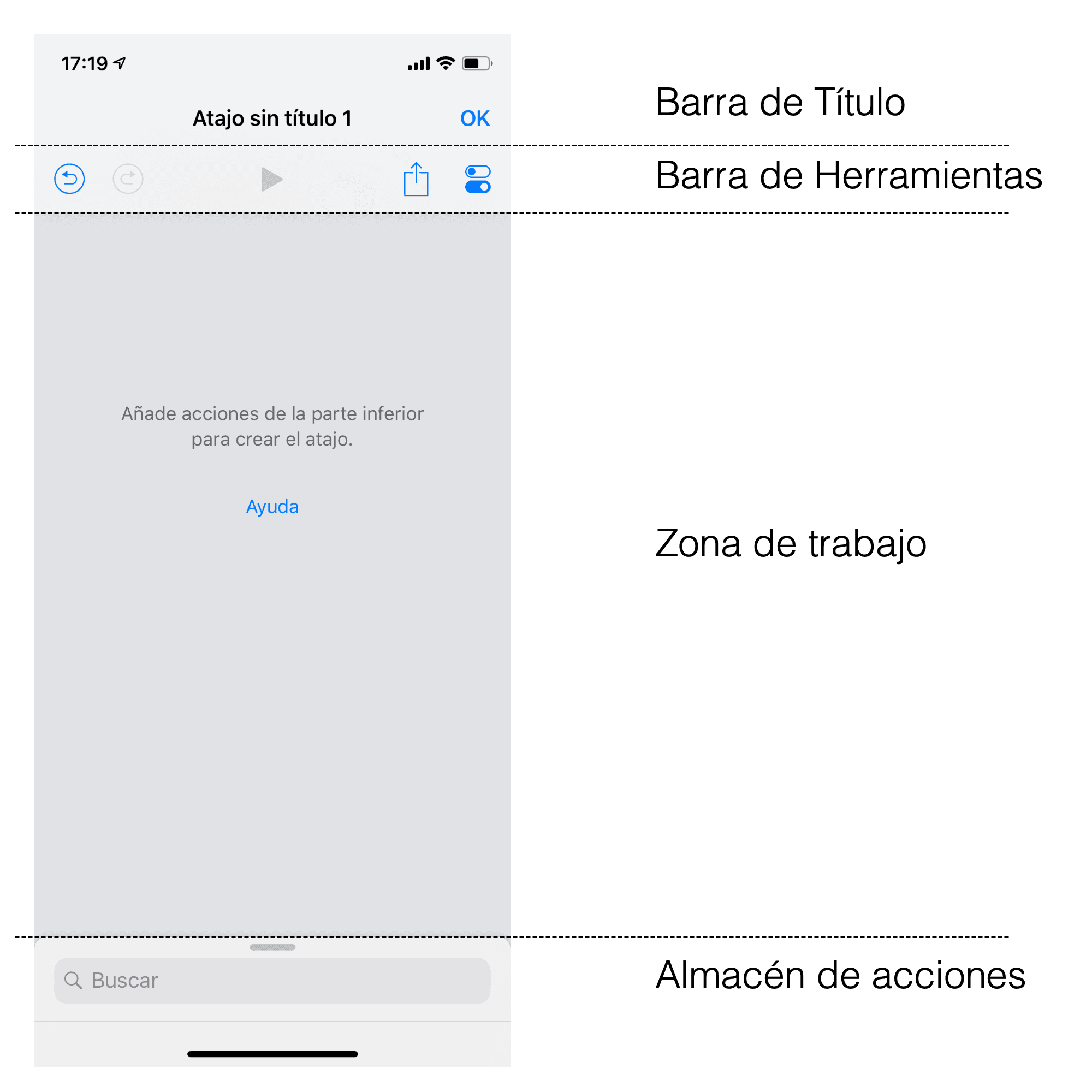 Ahi tenemos la parte superior con la barra de título, justo debajo está la barra de herramientas donde se puede Deshacer o Rehacer, ejecutar el atajo con el boton play, compartirlo o entrar en sus opciones.