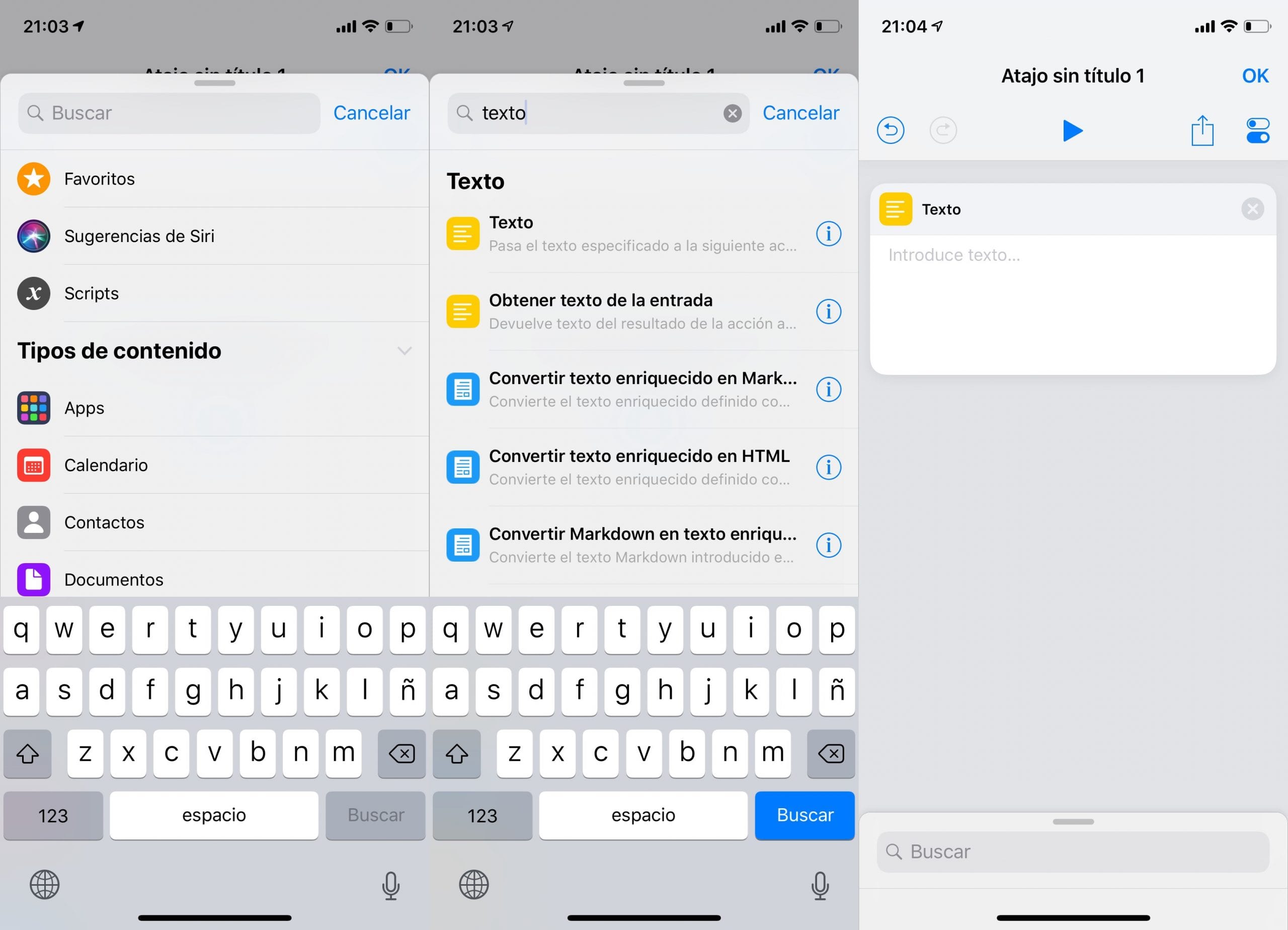 El primer paso será buscar las cajas de acción que eramos usar, os recomiendo navegar por los menus que hay para ir viendo qué se puede hacer, aunque no lo entendáis. Tambien os diré que aparecerán más o menos en función de las aplicaciones que tengáis en el movil, ya que éstas añaden acciones en atajos.