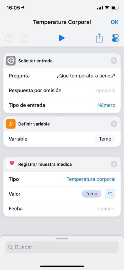 Vamos a hacer un atajo que nos permita guardar en los registros de Salud de nuestro móvil nuestra temperatura corporal, para cuando estamos enfermos y queremos ir viendo como evolucionamos. Lo llamaremos Temperatura Corporal.