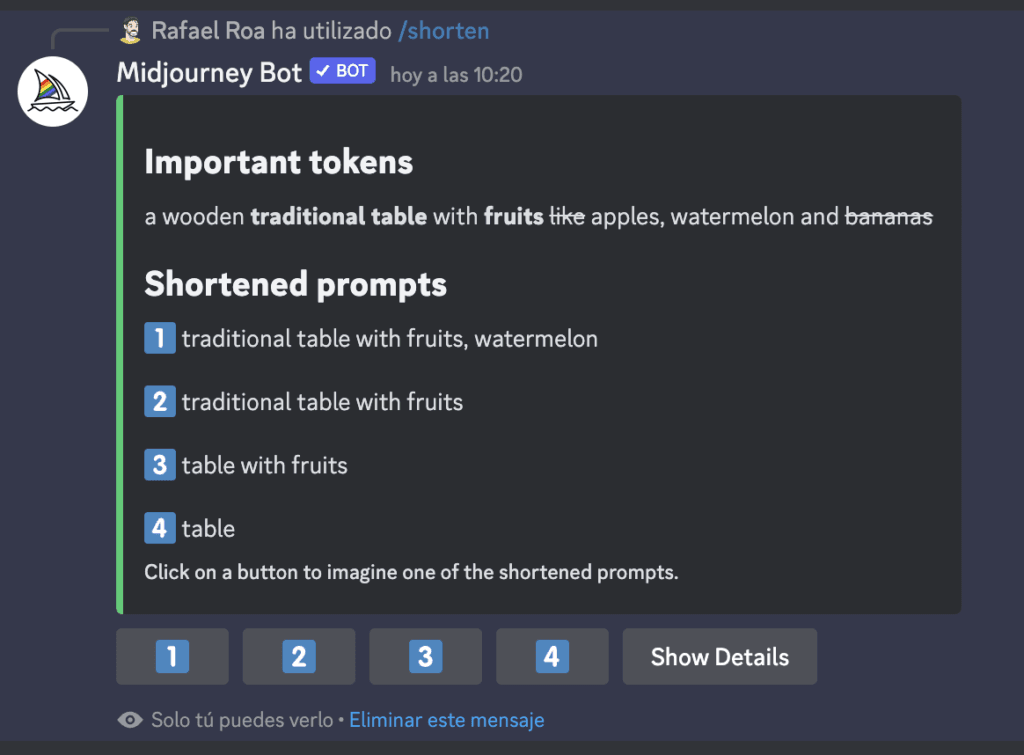 Si le aplico el comando /shorten, aprovechando que es una descripción muy larga me ofrece esto: