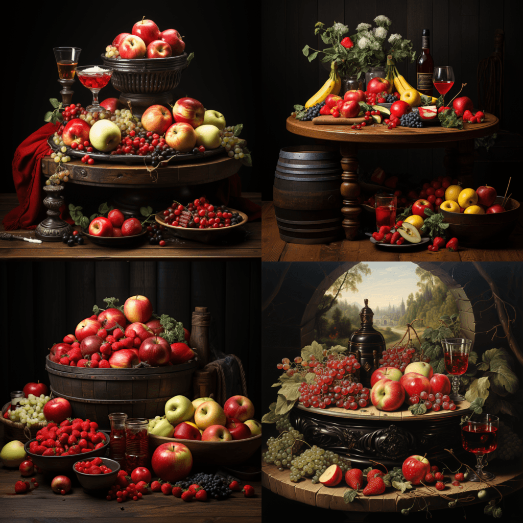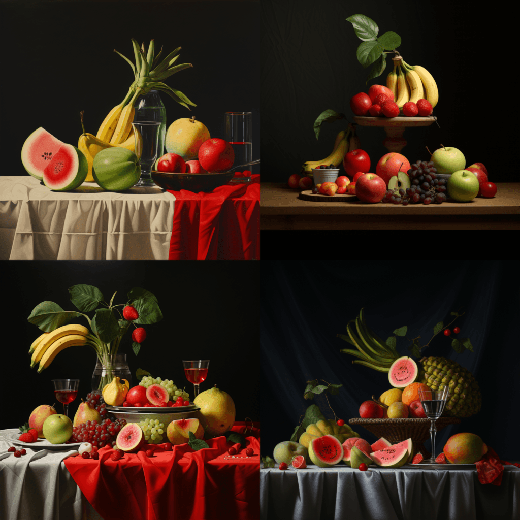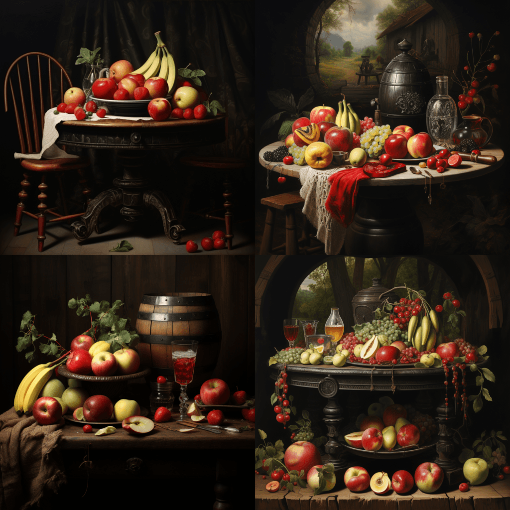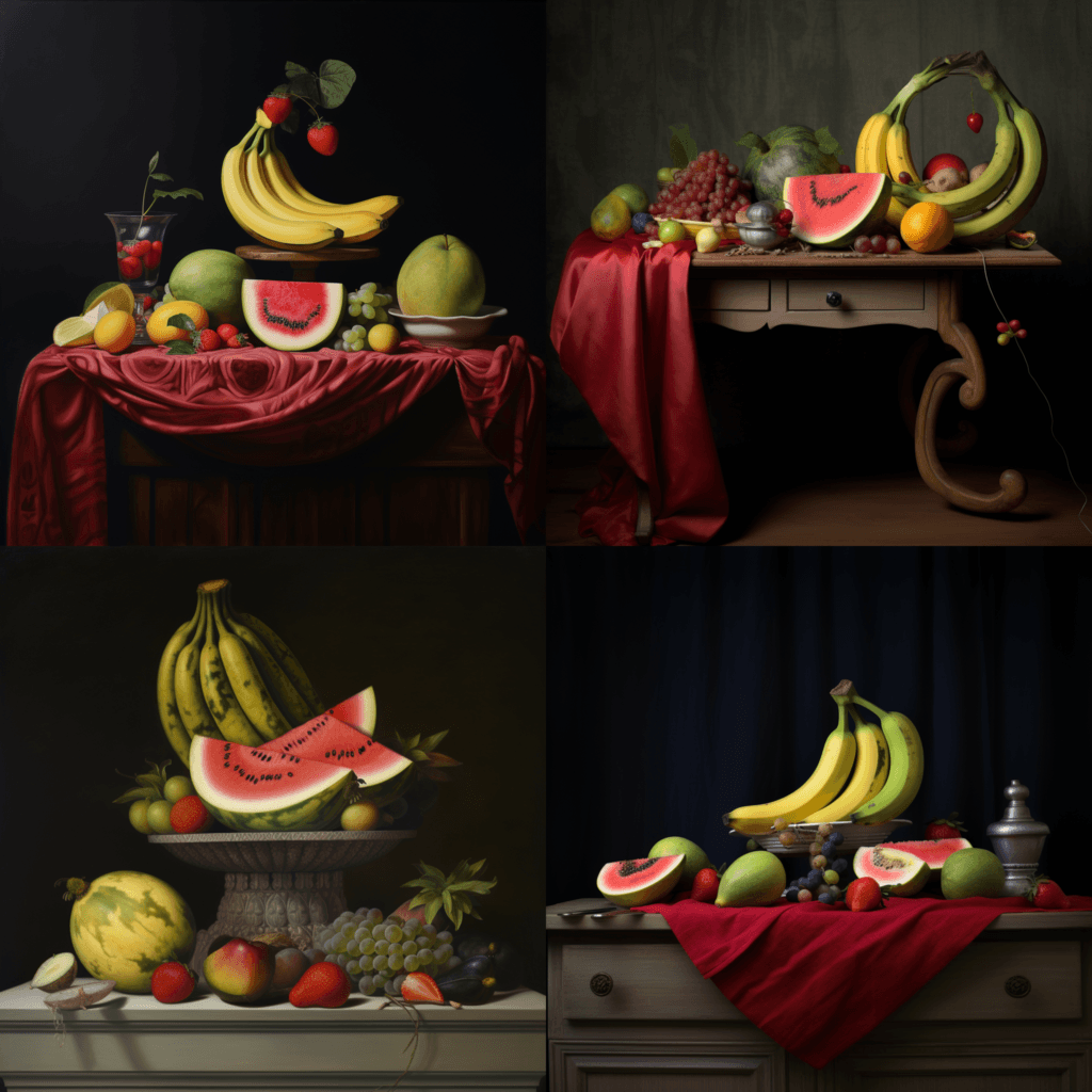 En este caso el resultado es en texto, por ejemplo para el «prompt» «a wooden traditional table with fruits like apples, watermelon and bananas»