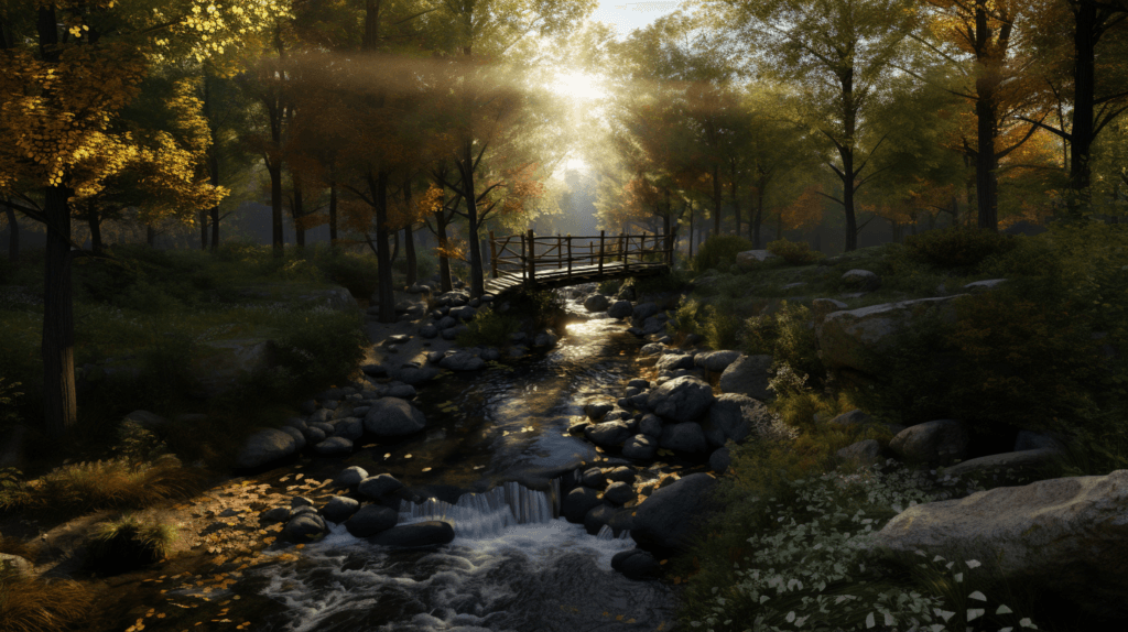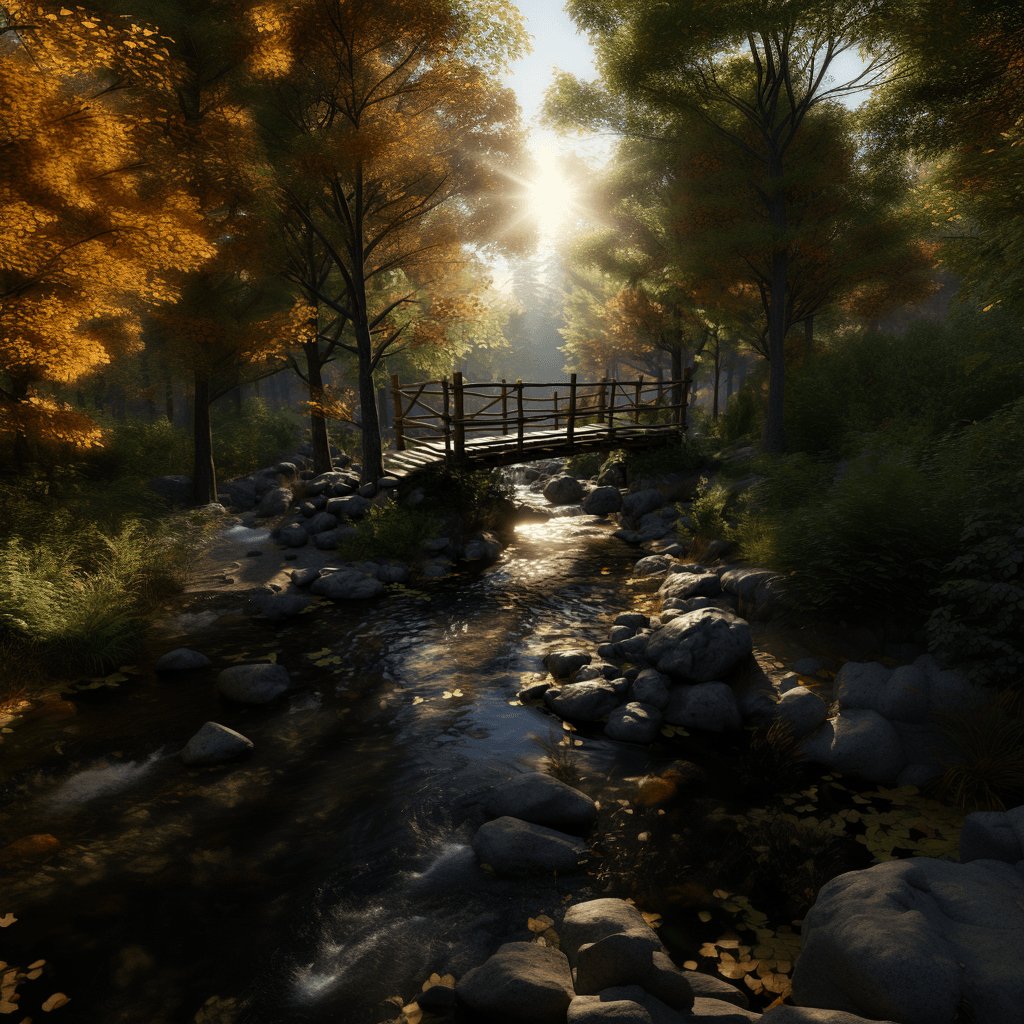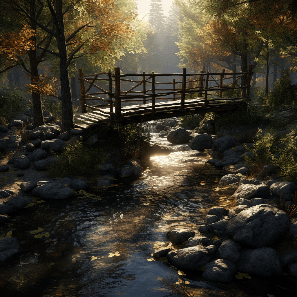 Visualize a scene in a tranquil forest, where an ancient wooden bridge spans a babbling brook. Near the foot of the bridge stands a four-way signpost, each sign pointing towards a different city. The bridge, made of weathered wood, blends harmoniously with the surrounding nature. The lighting is soft and diffused, with rays of sunlight piercing through the leafy canopy above. The colors are a mix of the forest's verdant greens and the bridge's rustic browns. The composition should be a wide shot, capturing the entirety of the bridge, the signpost, and the lush forest backdrop. Use a high-resolution camera with a wide-angle lens for this shot.