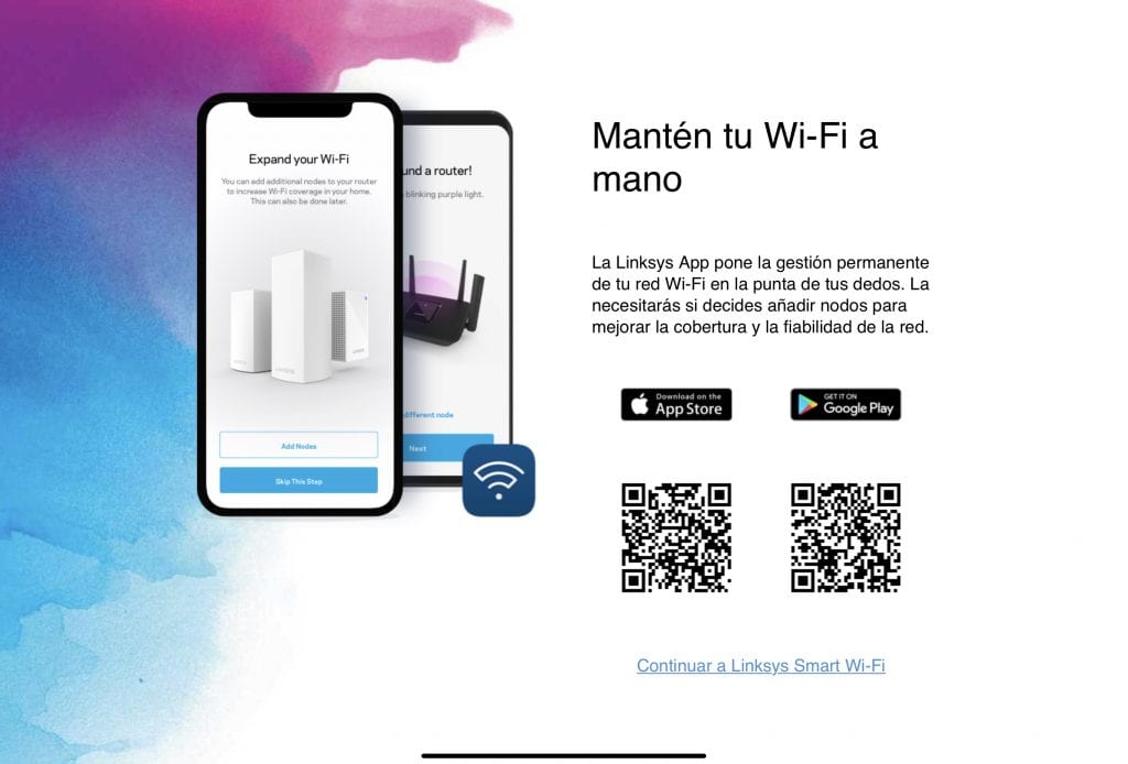 En esta página te instan a que uses las apps para iOS o Android, ya que lo que hagas a través de la app no puede estropear nada de tu wifi, pero nosotros queremos cambiar parámetros avanzados así que debemos pinchar en Continuar a Linksys Smart Wi-Fi que está bajo los códigos QR.