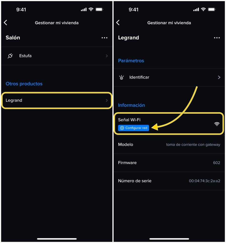 Pulsa sobre LEGRAND y bajo la sección “Información” aparece “Señal Wifi” y un texto en azul que pone “Configurar red”.